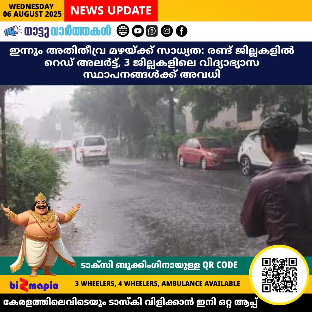 ഇന്നും അതിതീവ്ര മഴയ്ക്ക് സാധ്യത: രണ്ട് ജില്ലകളിൽ റെഡ് അലർട്ട്, 3 ജില്ലകളിലെ വിദ്യാഭ്യാസ സ്ഥാപനങ്ങൾക്ക് അവധി
