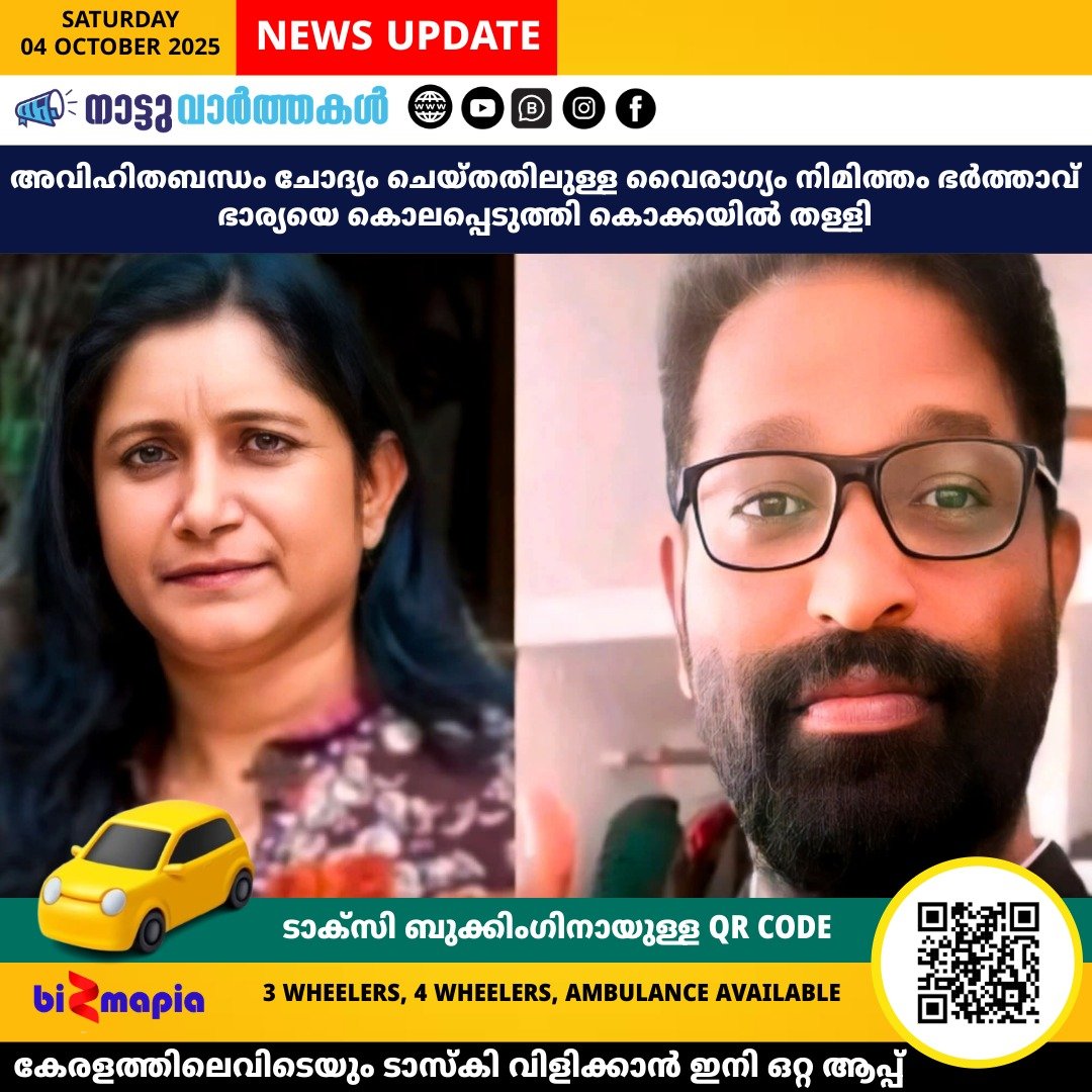 അവിഹിതബന്ധം ചോദ്യം ചെയ്തതിലുള്ള വൈരാഗ്യം നിമിത്തം ഭർത്താവ് ഭാര്യയെ കൊലപ്പെടുത്തി കൊക്കയില് തള്ളി
