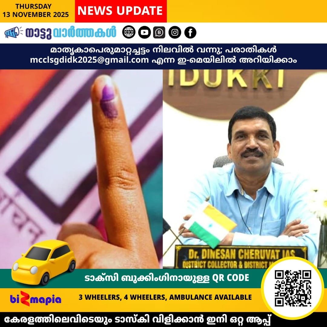 മാതൃകാ പെരുമാറ്റച്ചട്ടത്തിൻ്റെ ലംഘനവുമായി ബന്ധപ്പെട്ട പരാതികൾ mcclsgdidk2025@gmail.com എന്ന ഇ-മെയിലിൽ അറിയിക്കാം.